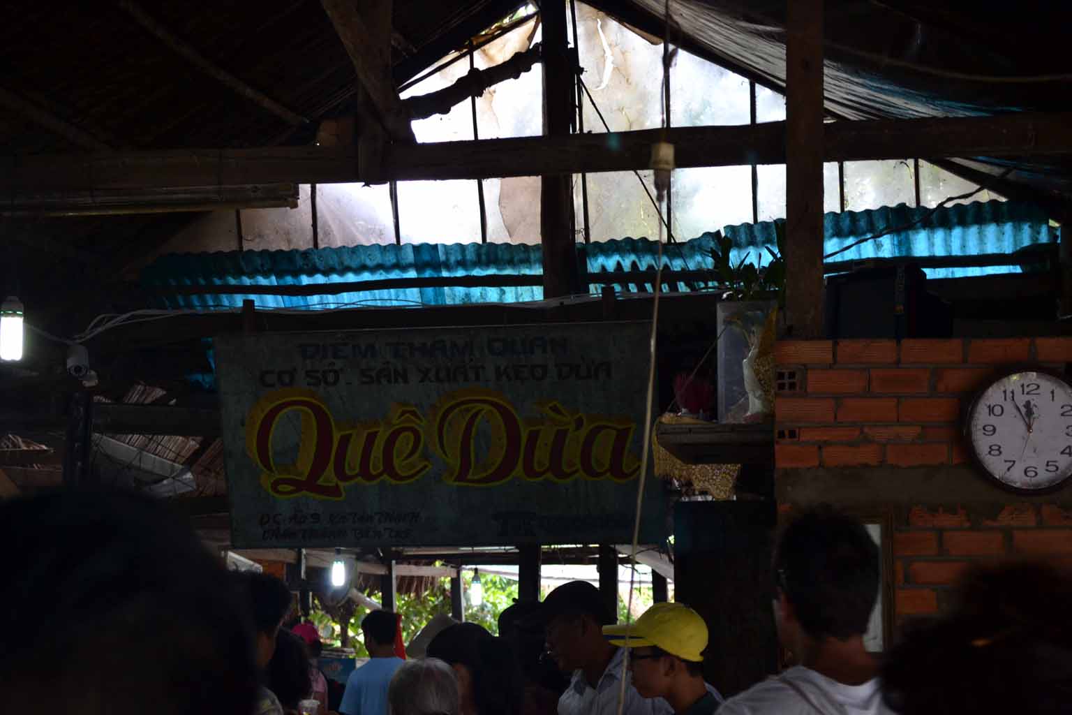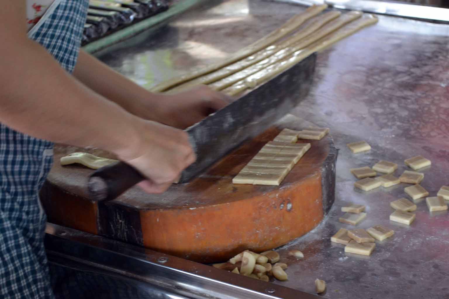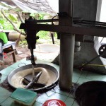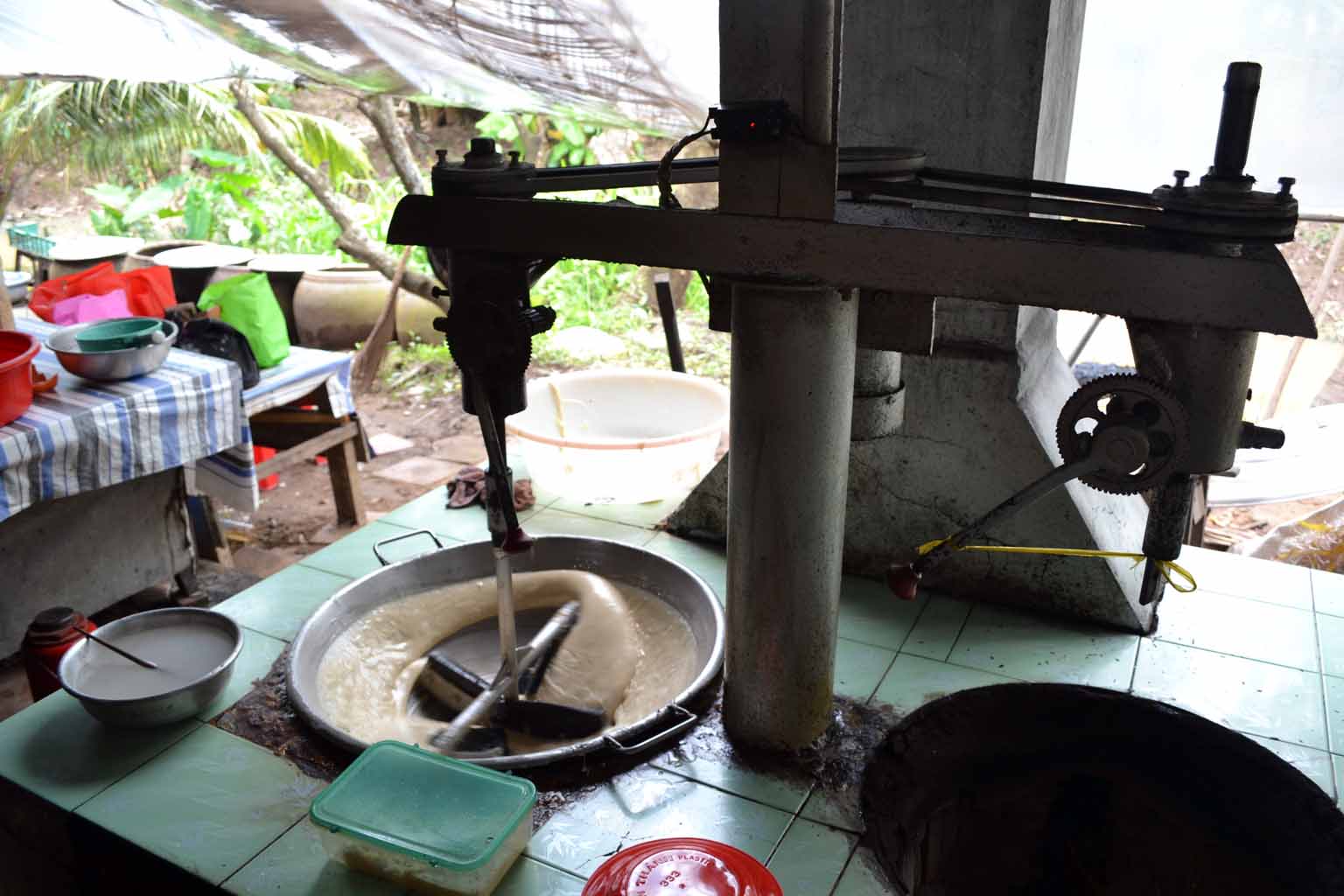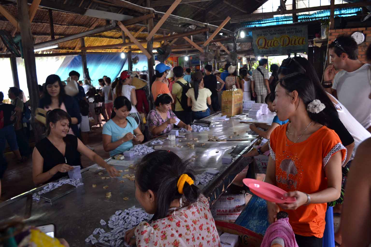 Sur une petite île….. Des cocos…. La pulpe de coco est recueillie avec cette machine Le jus est obtenu avec le pressoir Ensuite porté à ébullition Le malaxeur La chaîne de confection Le showroom 🙂 Pourquoi les hommes sont-ils nombreux sur ce stand ? Cobra plus fort que Viagra ! Gardé dans l’alcool il a la vertu paraît-il, de redonner vigueur aux messieurs d’un certain âge 🙂 Encore tout chaud, les bonbons sont calibrés grâce à ces tables rainurées en bois. Il faut aller très vite ! Rien ne se perd dans le coco et le cocotier, les écorces servent à la combustion Le caramel se refroidit sur ces rainures Les bonbons sont coupés à la main, tellement régulier que l’on croirait qu’ils sont coupés à la machine. Les morceaux coupés sont envoyés pour le conditionnement Sous l’oeil du contremaître… je rigole 🙂 Tiens, une touriste très gourmande et très souriante 🙂 Goûtez, c’est délicieux !