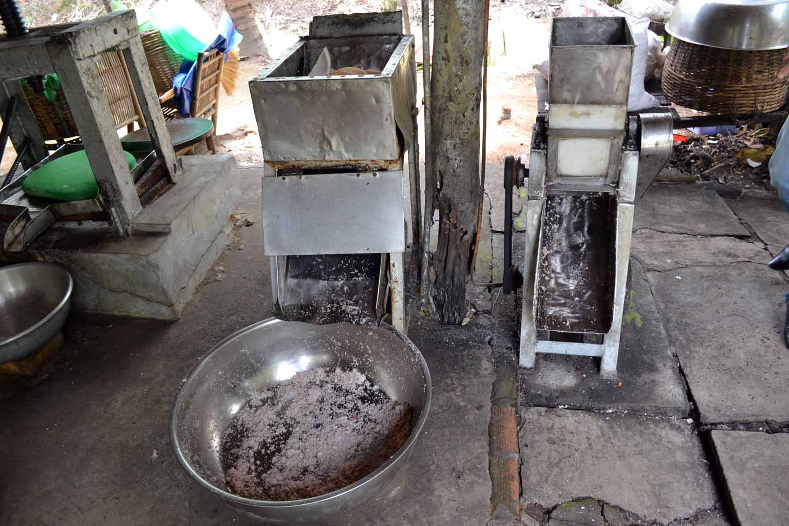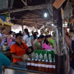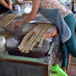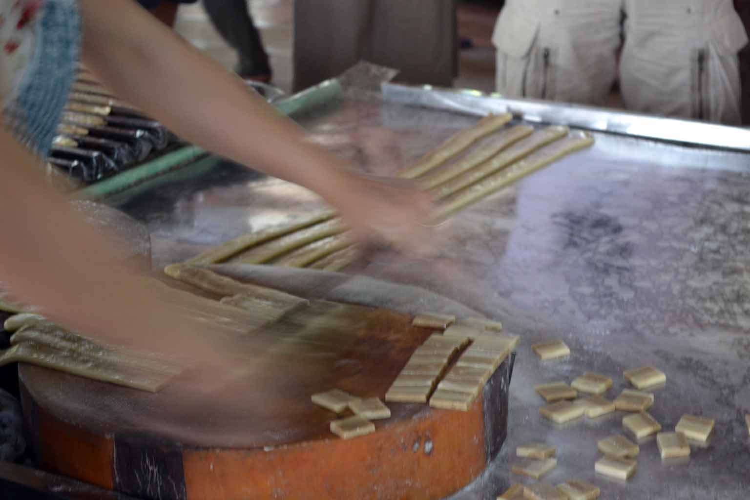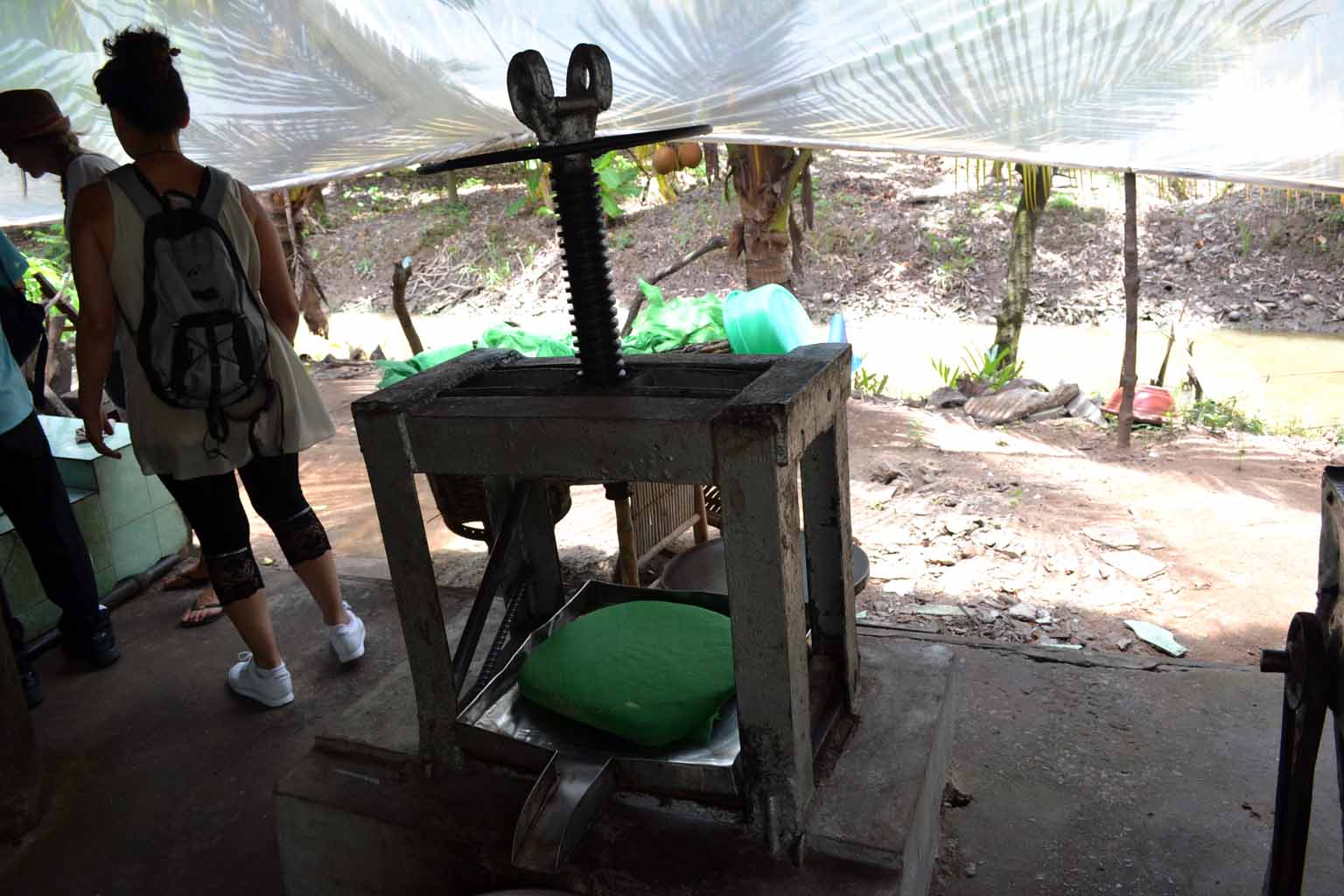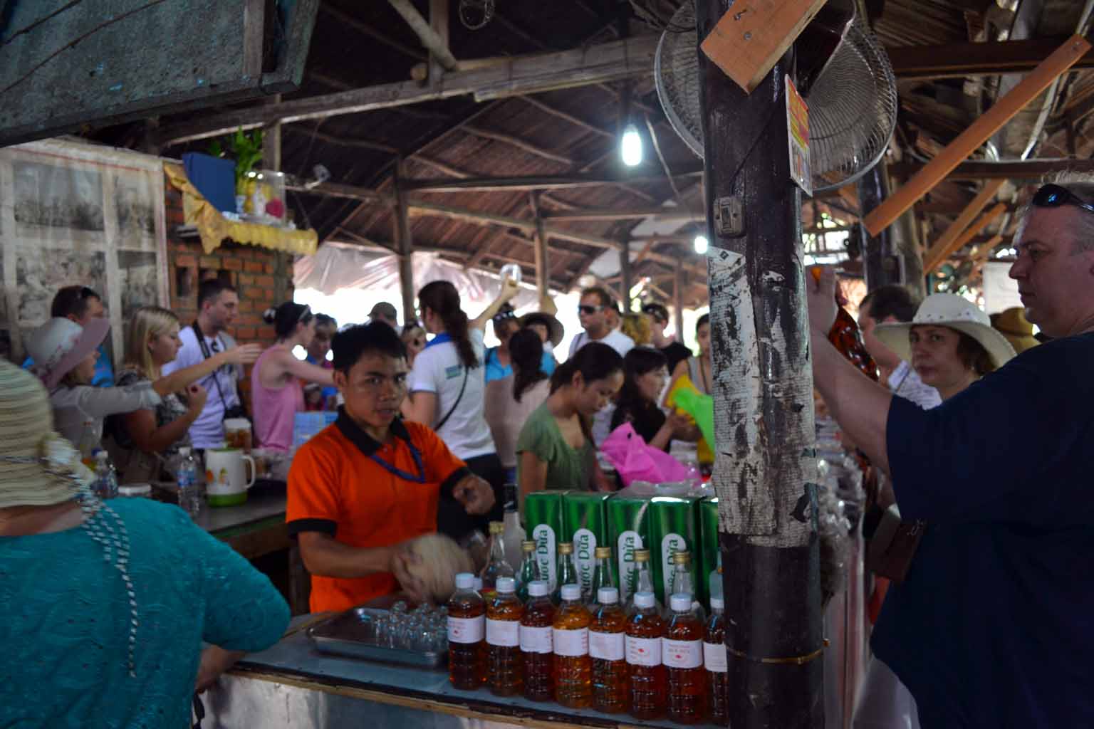 Sur une petite île….. Des cocos…. La pulpe de coco est recueillie avec cette machine Le jus est obtenu avec le pressoir Ensuite porté à ébullition Le malaxeur La chaîne de confection Le showroom 🙂 Pourquoi les hommes sont-ils nombreux sur ce stand ? Cobra plus fort que Viagra ! Gardé dans l’alcool il a la vertu paraît-il, de redonner vigueur aux messieurs d’un certain âge 🙂 Encore tout chaud, les bonbons sont calibrés grâce à ces tables rainurées en bois. Il faut aller très vite ! Rien ne se perd dans le coco et le cocotier, les écorces servent à la combustion Le caramel se refroidit sur ces rainures Les bonbons sont coupés à la main, tellement régulier que l’on croirait qu’ils sont coupés à la machine. Les morceaux coupés sont envoyés pour le conditionnement Sous l’oeil du contremaître… je rigole 🙂 Tiens, une touriste très gourmande et très souriante 🙂 Goûtez, c’est délicieux !