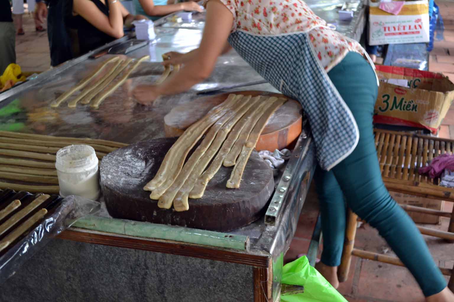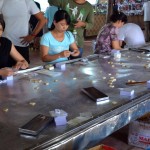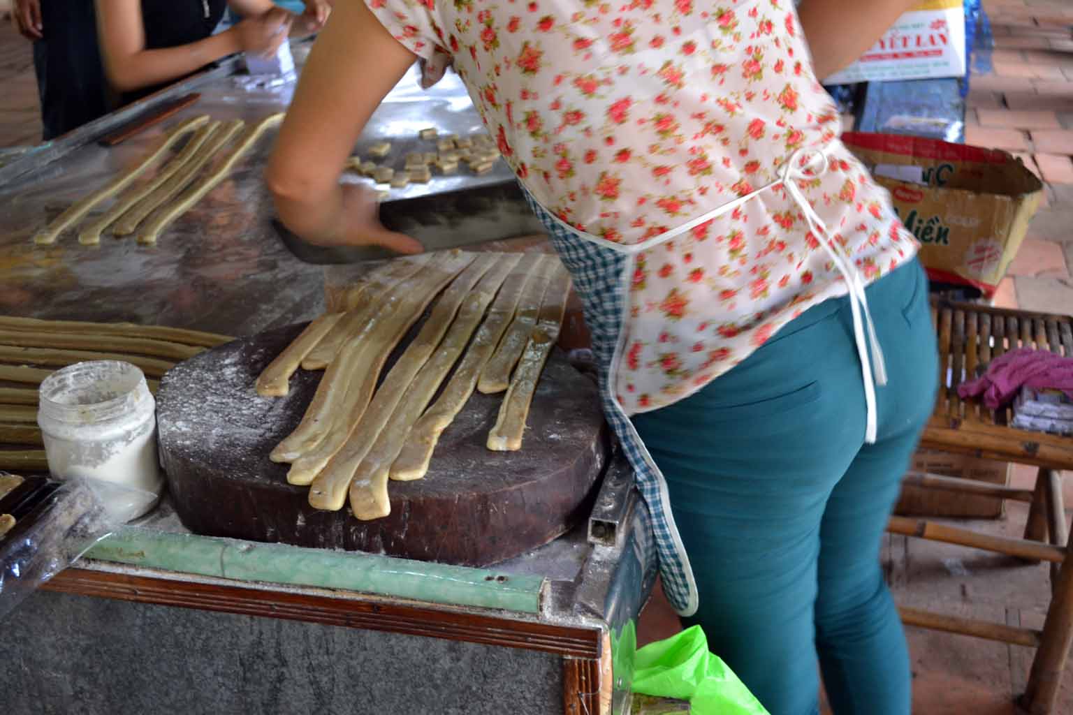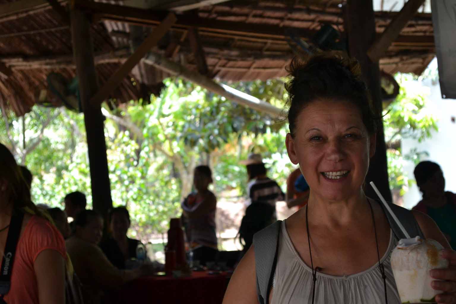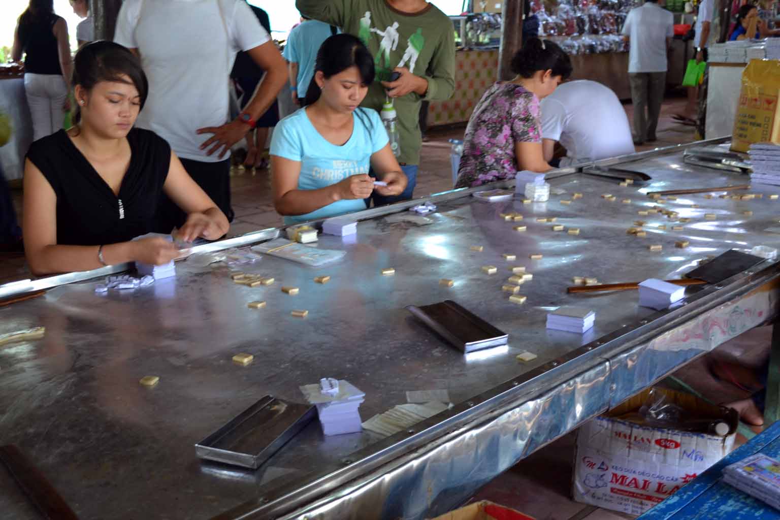 Sur une petite île….. Des cocos…. La pulpe de coco est recueillie avec cette machine Le jus est obtenu avec le pressoir Ensuite porté à ébullition Le malaxeur La chaîne de confection Le showroom 🙂 Pourquoi les hommes sont-ils nombreux sur ce stand ? Cobra plus fort que Viagra ! Gardé dans l’alcool il a la vertu paraît-il, de redonner vigueur aux messieurs d’un certain âge 🙂 Encore tout chaud, les bonbons sont calibrés grâce à ces tables rainurées en bois. Il faut aller très vite ! Rien ne se perd dans le coco et le cocotier, les écorces servent à la combustion Le caramel se refroidit sur ces rainures Les bonbons sont coupés à la main, tellement régulier que l’on croirait qu’ils sont coupés à la machine. Les morceaux coupés sont envoyés pour le conditionnement Sous l’oeil du contremaître… je rigole 🙂 Tiens, une touriste très gourmande et très souriante 🙂 Goûtez, c’est délicieux !
